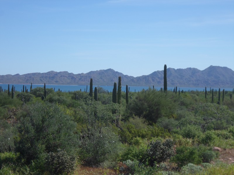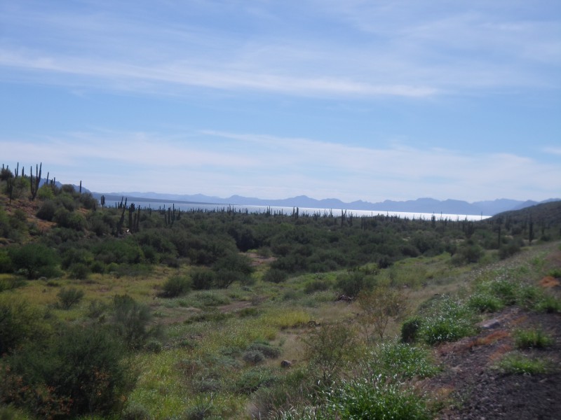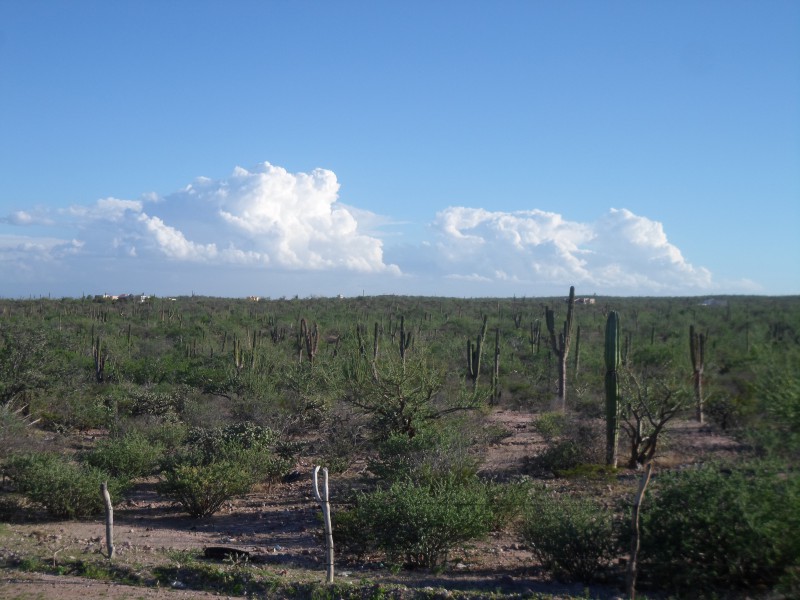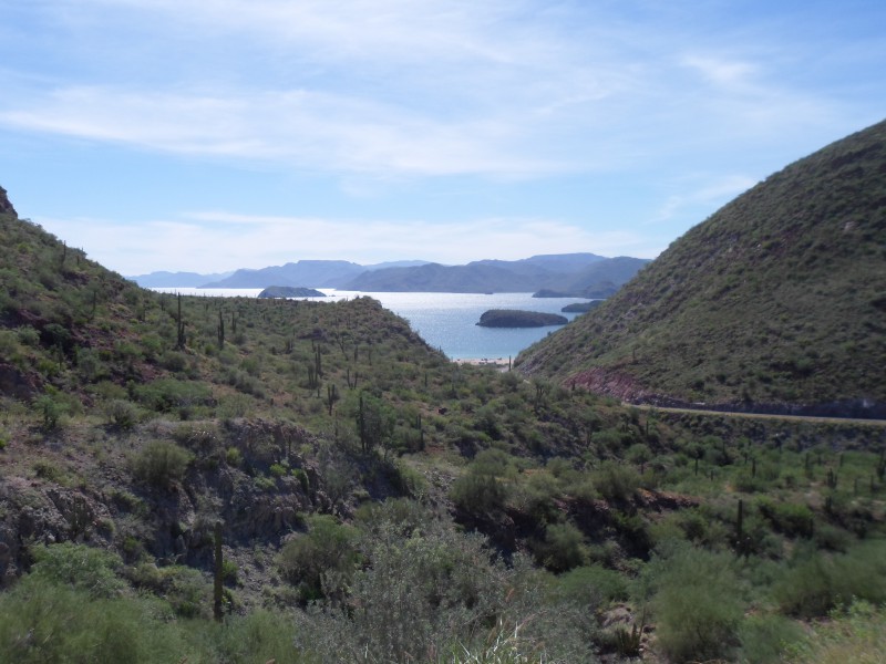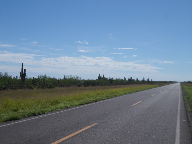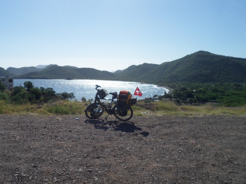 Nach den Strandtagen bereiteten wir uns bereits mental auf die Überquerung der Sierra de la Giganta vor. Es begann mit ein bisschen auf und ab am Meer entlang und bei km 8’999 verlor ich auf einer kurzen aber rasanten Abfahrt meine Fresca-Flasche. So musste ich km 9’000 meiner Tour dann halt mit Wasser begiessen. Da ich auch noch eine Wasserflasche verloren hatte, war ich froh, dass wir vor der grossen Steigung nochmals an einem Laden vorbeikamen. Vor der Weiterfahrt packte ich aber meine Tasche nochmals etwas um – man lernt ja schliesslich. Danach knickte die Strasse vom Meer weg und wir pedalten bei mässigem Verkehr bergan. Bereits nach kurzer Zeit kamen wir an eine einspurige Baustelle mit langer Kolonne. Ich versuchte, trotzdem durchzufahren, der Verkehrsregler ermunterte uns. Als wir um die nächste Kurve kamen, wussten wir, weshalb die Kolonne so weit zurückreichte und auch keine Fahrzeuge entgegenkamen: ein Lastwagen hatte im Baustellenbereich anscheinend einen durch Bremsversagen verursachten Unfall und blockierte zusammen mit den nun stützenden Baumaschinen die gesamte Fahrbahn. Tja, während man in der Schweiz fleissig Fahrzeugservice, Abgastest usw. machen und das dann auch noch bei der MFK kontrollieren lässt, setzt man hier eher auf Stossgebete und so dürften in lateinamerikanischen Garagen und Werkstätten Heiligenbilder, Rosenkränze, Kreuze usw. in der Verkaufshitparade noch weit vor Reifen, Bremsen oder sonst was kommen 😉 Jedenfalls war dem Fahrer glücklicherweise nichts passiert und es standen auch genügend Arbeiter rum, die uns helfen konnten, die Fahrräder halb über die und halb neben der Maschine durch zu tragen. Auf der anderen Seite waren die Wartenden natürlich ganz gespannt auf Neuigkeiten. Wir genossen danach die lange Sperre und fuhren ohne Verkehr weiter in die Sierra. Am Mittag hatten wir unser Tagesziel eigentlich erreicht – wir wollten bei einem der wenigen Restaurants unterwegs zelten. Ich fühlte mich aber noch recht gut und auch die anderen beiden wollten noch etwas weiterfahren. Bei der zweiten Lonchería erzählte man uns, in ca. 20 km hätte es einen kleinen Markt. Der kam zwar nie, dafür hatten wir nach 10 km den höchsten Punkt erreicht und so konnten wir bei ca. 1% Gefälle mit angenehmem Rückenwind dahindüsen. Schliesslich erreichten wir Ciudad Insurgentes, wo wir uns ein Zimmer nahmen und essen gingen. Auf dieser Etappe zeigte sich die Baja California sehr abwechslungsreich. Wir starteten entlang von Meer und Stränden, fuhren dann ins Gebirge, durch ein langes Tal und schliesslich durch eine weite Ebene ohne Berge am Horizont.