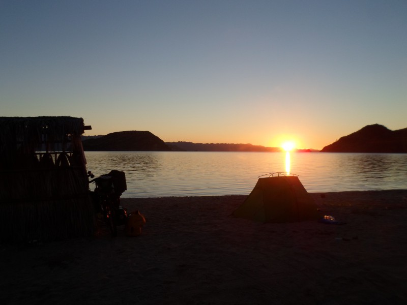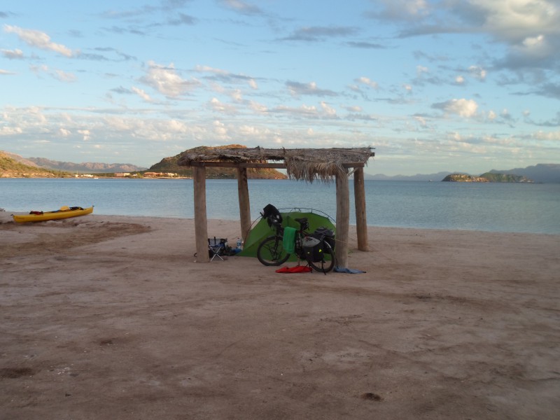 Nun folgten zwei kurze Radtage. Wir wollten die schönen Strände der Bahía Concepción etwas geniessen. Gleich nach Mulegé kauften wir nochmals ein, dann machten wir uns auf die knappe Stunde Fahrt zum ersten (Privat-) Strand. Dort liessen wir uns für eine Nacht zum zelten nieder. Der Strand schien aus Muschelteilchen und kleinen Steinchen zu bestehen, war also etwas grober als beispielsweise die Sandstrände auf der Pazifikseite. Von Gefälle konnte schon fast keine Rede mehr sein. Ich wollte die kleine Bucht durchschwimmen, konnte bei Ebbe aber beinahe rüberwaten. Der kleine Strand ist offensichtlich auch bei nordamerikanischen Langzeitreisenden oder Auswanderern sehr beliebt. So konnte ich im Verlauf des Tages einige nette Plaudereien führen.
