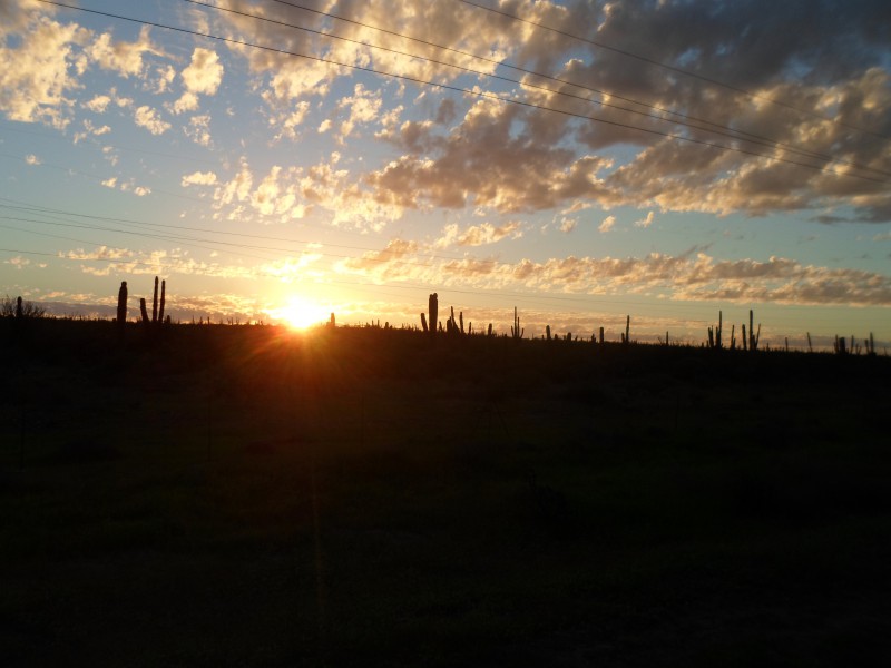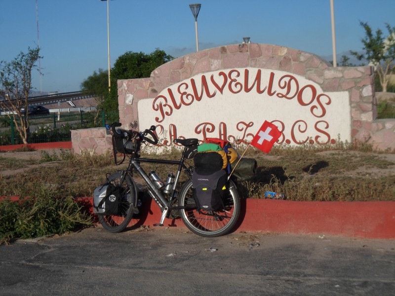 Am Vorabend hatte zum Schluss der Wind gedreht, sodass er von Norden kam. Da wir uns nun auf eine schnurgerade, 70 km lange Strasse machten, wünschten wir uns diesen Wind wieder. Leider kam er den ganzen Tag von allen möglichen Seiten. Kurz nach Ciudad Constitución wartete ich auf die beiden. Als ich wieder losfuhr, sah ich eine der Wasserflaschen wackeln. Also hielt ich nochmals an. Ich war bereits am festzurren, als Mohsen hinter mir eine Vollbremsung vollzog, worauf Georgie in seinem Windschatten nicht mehr rechtzeitig reagieren konnte und ihm hinten auffuhr. Vielleicht wäre es doch besser, bei Konzentrationsproblemen nur im Stillstand am MP3-Player rumzuhantieren! In Las Pocitas empfahl der Blog, dem Georgie und Mohsen folgten, bei der Polizei oder der Kirche nach zufragen. Wir erreichten das Dorf, als es bereits dunkelte. Natürlich hatte auch die Messe gerade eben begonnen, sodass wir noch nicht fragen konnten. Danach durften wir unsere Zelte aber vor der Kirche unter einem Dach aufstellen. Auf dem Rückweg vom Abendessen wollte ich bei einem Privathaus mit entsprechendem Schild noch etwas Käse für das nächste Mittagessen kaufen. Da sie nur ganze Laiber verkauften, schenkte sie mir einfach einen ordentlichen Mocken 🙂