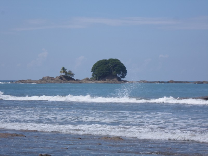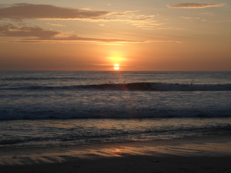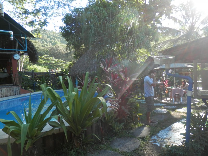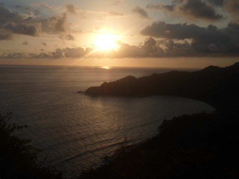 Als ich aufwachte, hatte Papi schon eine Runde im Meer und im Hotelpool hinter sich. Wir frühstückten, checkten aus und machten uns auf den Weg zur Fähre. Wir waren dann auch nicht die einzigen mit dieser Idee. Die Fähre um 09.00 war bereits gefüllt und bei der langen Kolonne für jene um 11.00 schien es uns unsicher, ob wir wirklich noch Platz finden würden – also das Problem habe ich mit dem Fahrrad relativ selten 😉 Wir entschieden uns dann dafür, um den Golf rumzufahren und ca. drei Stunden später waren wir auch auf der anderen Seite. Beim Wegweiser nach Naranjo kam uns dann etwas spät die Idee, dass wir es auch mit der anderen Fähre etwas weiter nach Norden hätten versuchen können. Schliesslich erreichten wir dann aber doch Montezuma, wo wir aber schnell feststellten, dass eine Unterkunft für diese Nacht ein Ding der Unmöglichkeit war. Also wieder in ein Restaurant, einen tollen Frucht- oder Schokodrink geniessen und Alternativen beratschlagen. Per Internet fanden wir dann ein Zimmer im ca. 10km entfernten Sta. Teresa. Dort angekommen waren wir ziemlich überrascht, dass es dort ja viel mehr Unterkünfte gab, als auf der Buchungsplattform. Das Hostel hatte in den vergangenen Stunden die Internetbuchungen nicht aktualisiert und unser Zimmer bereits anderweitig vergeben. Wir kriegten dann aber ein grösseres Zimmer zum selben Preis, das aber nicht allzu sauber war. Trotz der schön gestalteten Umgebung mit Pool, Bar und Tischchen, beschlossen wir, nur eine Nacht zu bleiben. Die Zeit reichte dann gerade noch, um für den Sonnenuntergang zum Strand runter zu gehen. Dort konnten wir uns auch über ein bisschen grössere Wellen freuen – anscheinend ein Surfer-Kaff. Wir gönnten uns dann noch ein Bad im Hostelpool und fanden später ein tolles Café/Restaurant mit Bäckerei – oder umgekehrt.