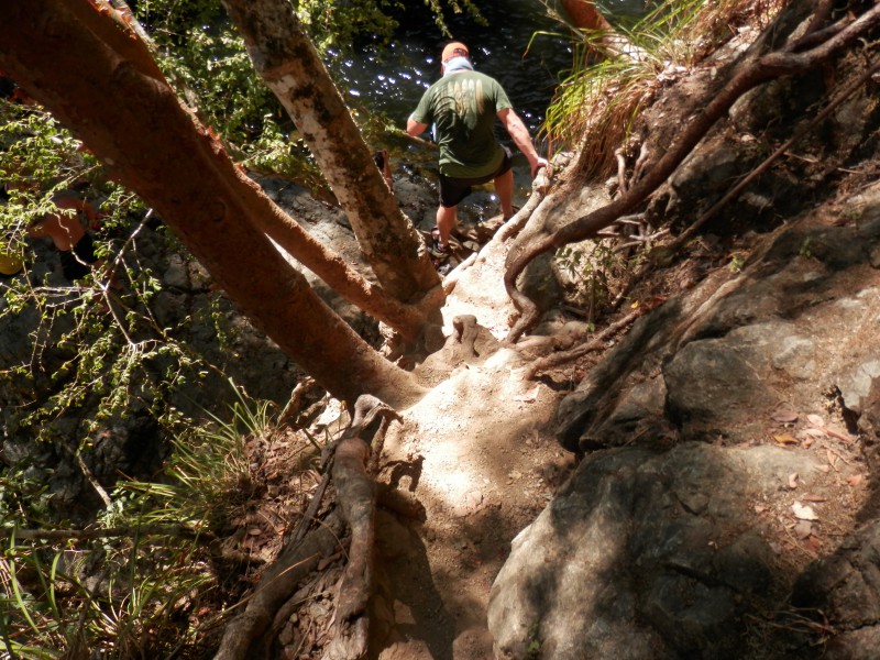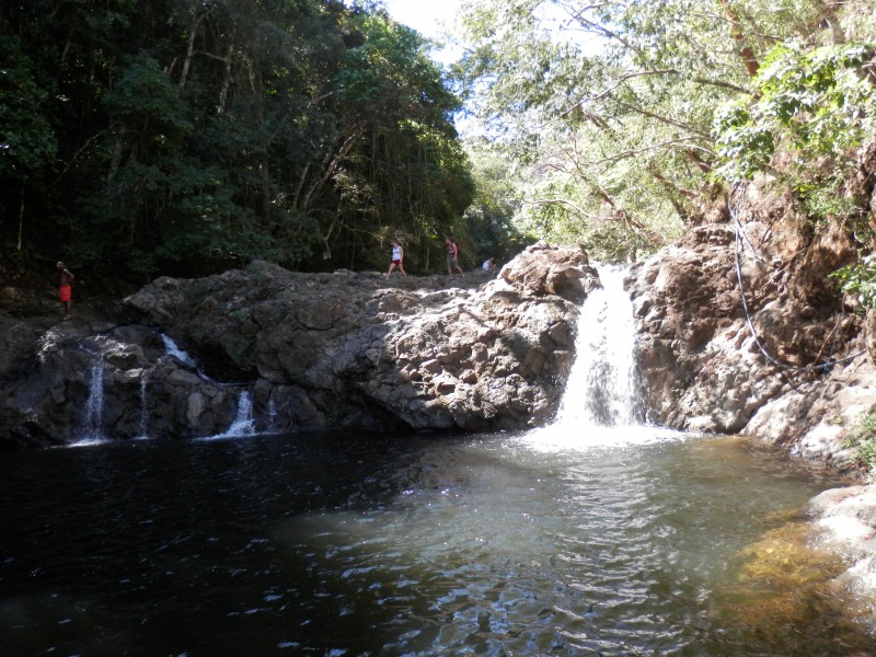 Heute wollten wir zeitig los, mussten dann aber feststellen, dass unser Auto von den Hostelfahrzeugen zuparkiert war. Nach einige Sucherei fand der Besitzer dann seinen Bruder mit dem Schlüssel und wir konnten los. Wir wollten nochmals zurück nach Montezuma und zu den Wasserfällen hochwandern und -kraxeln. Teilweise ist der “Weg” so steil und schlechte, dass Seile angebracht wurden. Die Wasserfälle ergiessen sich in mehreren Etappen ins Tal, sodass drei oder vier natürliche Becken entstanden sind. Natürlich wollten wir zum höchstgelegenen, wo wir mit einem tollen Ausblick und ich mit einem erfrischenden Bad belohnt wurden. Bald mussten wir uns aber wieder an den Abstieg machen, mussten wir doch noch weiter nach Norden und irgendwo eine Unterkunft finden. In diesem Teil Costa Ricas sind grösstenteils nur Schotter- oder Erdstrassen vorhanden. Das bringt zwar weniger Verkehr, viel Fahrerlebnis und viele schöne Aussichten, allerdings auch eine wesentlich niedrigere Geschwindigkeit. Bereits im Dunkeln erreichten wir also Sámara, wo wir nach einiger Fragerei doch noch ein Zimmer ergattern konnten.