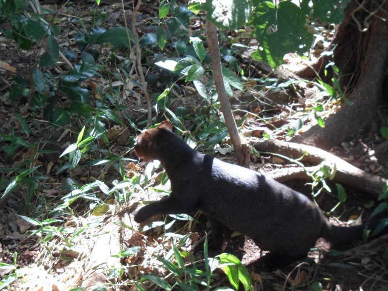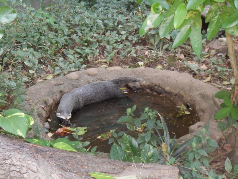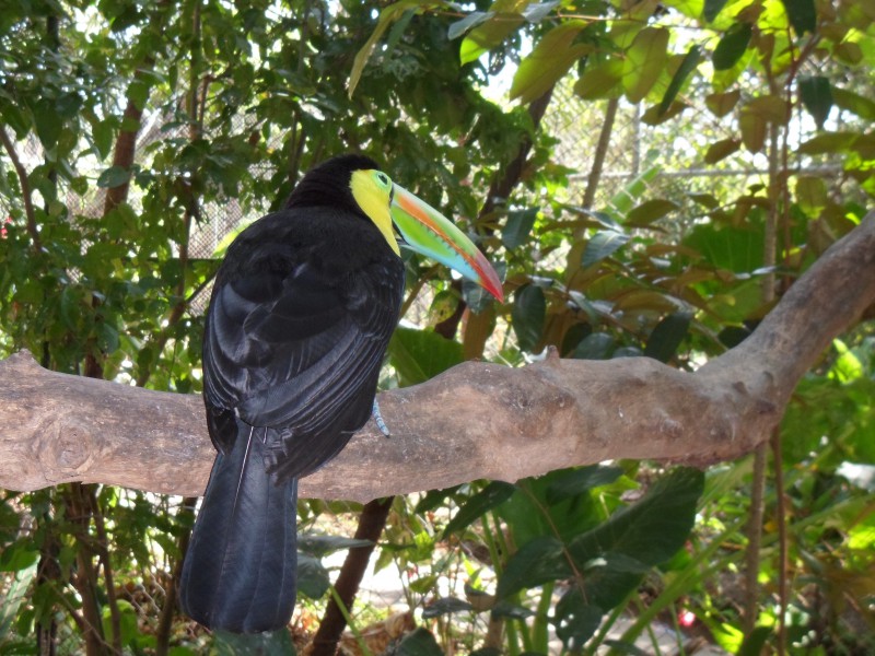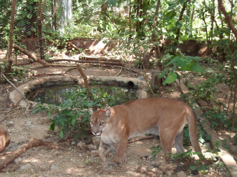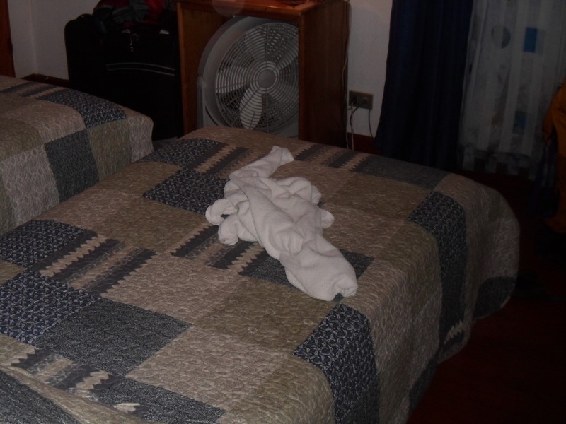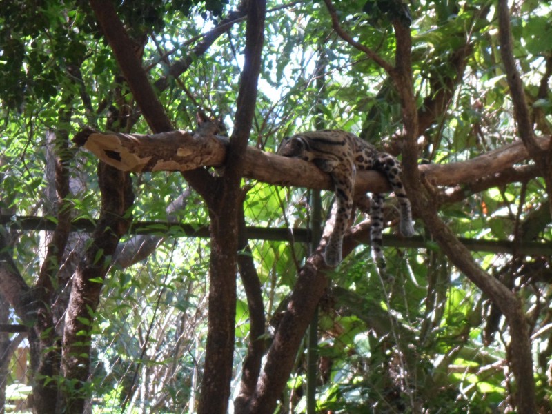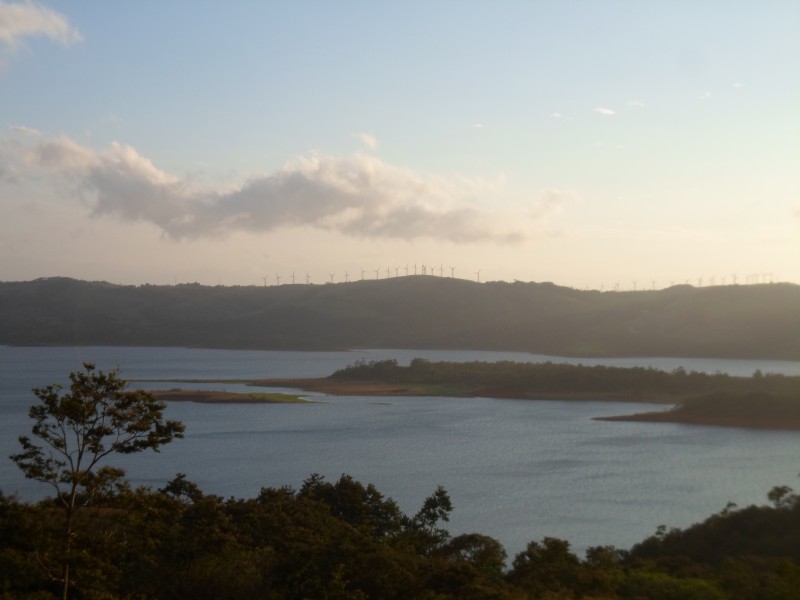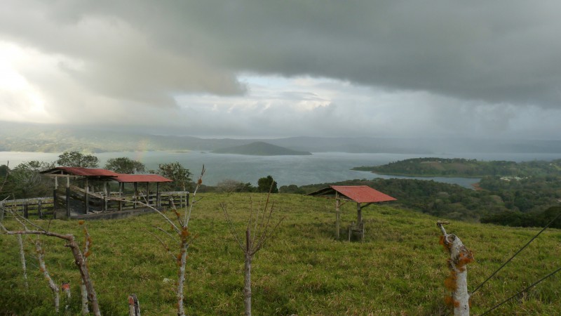 Langsam neigte sich unser Urlaub seinem Ende zu. Für die letzten drei Nächte wollten wir uns in der Pequeña Helvecia einquartieren – und diesmal hatten wir auch rechtzeitig reserviert. Auf dem Weg zur Laguna Arenal, einem Stausee ca. in der Grösse des Zürichsees, stoppten wir wie empfohlen kurz vor Cañas bei einem anderen Schweizer, der als 13-Jähriger mit seinen Eltern ausgewandert war. Wir besuchten seinen Zoo bzw. die Station für verletzte oder verstossene Tiere. Hier bekamen wir ein bisschen mehr von dem Getier zu Gesicht, das sich irgendwo in den Wäldern rumtreibt – und vor allem die “Kätzchen” sind hinter Gitter doch viel herziger… Nach dem Mittagessen im dazugehörigen Restaurant erzählte uns der Besitzer ein wenig von seiner Geschichte (so war er z.B. der erste Anbieter von Riverrafting-Touren) und liess uns an seinem statistischen Wissen teilhaben. Dann erreichten wir auch schon den See. Unterwegs zum Hotel hielten wir bei “Café y Macadamia”. Dort genossen wir wieder mal einen Fruchtdrink, die schöne Aussicht und natürlich eine Tüte gebrannte Macadamianüsse mit Zimt. Am Abend erreichten wir dann unser Ziel. 1989 begann die Geschichte “klein Helvetiens” mit dem Bau eines Kuhstalls durch das costaricanisch-schweizerische Paar. 1991 kam dann das Hotel dazu. Passend zu 700 Jahre Eidgenossenschaft und 100 Jahre costaricanischer Demokratie heisst es Los Héroes und die Fassade ziert ein Bild mit Arnold von Winkelried und Juan Santamaria. Später kamen dann eine 3,5km lange Bahn, eine Kapelle sowie ein Panoramarestaurant dazu. Leider wurde in den letzten paar Jahren der Unterhalt etwas vernachlässigt, was man halt auch schnell sieht. Schade, vor allem wenn man bedenkt, dass es teilweise an Kleinigkeiten wie nicht geschlossenen Fenstern bei Bahn und Bus liegt. Dafür wurden wir im ZImmer dann von einem Krokodil überrascht. Den Tag liessen wir dann im Restaurant ausklingen, Papi bei einem Caramelköpfchen, ich bei einem Bananensplit: nur 1 Kugel Glace, mit Kaffee beträufelt anstatt der Schokosauce (bääähhh) und mit Haferflocken (?!?) bestreut 😉
