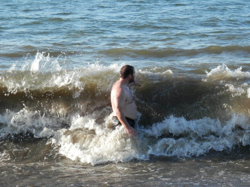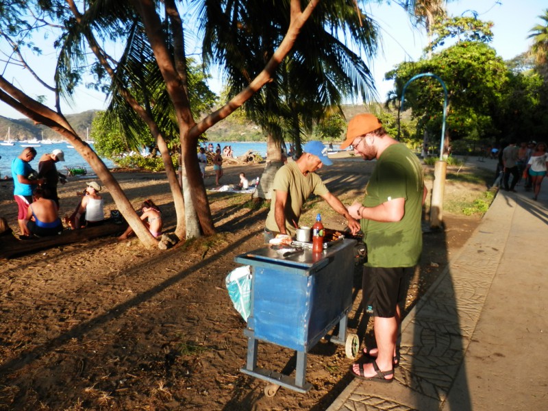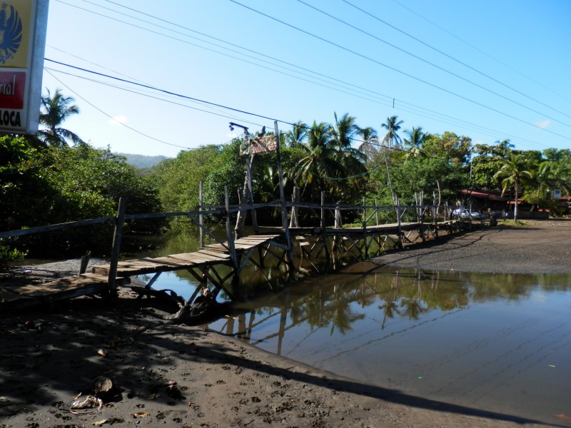 Diesmal mussten wir den Strandbesuch auf den Morgen ansetzen. Dafür konnten wir die Weiterfahrt etwas ruhiger angehen, hatten wir am Vorabend doch bereits eine Unterkunft in Playas del Coco gebucht. Weiter ging’s also erst noch auf Schotter, später dann auf Asphalt. Bereits zum Mittagessen erreichten wir die Playa Hermosa, die ich ebenso wie unser Tagesziel noch von meinem Costa Rica-Urlaub 2010 kannte. Wir beschränkten uns dort aber auf einen Strandbummel und verschoben die Planscherei auf später. In Playas del Coco fanden wir dann schnell unser Hotel. Wir checkten ein und gingen zum Strand. Diesmal hatten wir wohl die Flutzeit erwischt und einige Wellen kamen ziemlich heftig herein – bis mich sogar eine im etwas mehr als knietiefen Wasser umwarf! Daraufhin mussten wir uns dann mit einem Spiesschen von einem Strand stärken. Auch den freundlichsten Souveniershop-Besitzer hatte ich noch in Erinnerung und wir statteten ihm einen Besuch ab. Schliesslich vertagten wir die Entscheidung (ohne Geld ist Souvenirshopping sowieso schwierig) und gingen zurück zum Hotel. Zum Abendessen gab’s diesmal eine sehr leckere Pizza. Zum Schluss kam ich mit dem Besitzer aus dem kanadischen Montreal noch ins Gespräch und er gab uns noch einige Tipps für unseren Weg zurück ins Hochland mit. Wieder einmal liessen wir den Tag bei einem Drink im Hotelpool ausklingen.