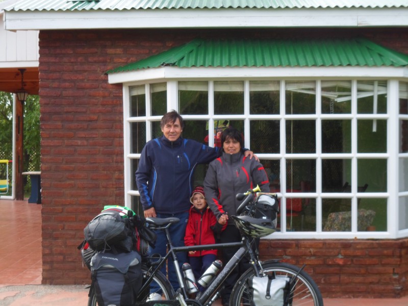 Da ich auf einen Bus nach Ushuaia einige Tage hätte warten müssen und der Sommer im Süden schon bald zu Ende geht, entschied ich mich, Feuerland auf eine nächste Reise zu verschieben und mich direkt auf den Weg zu den Nationalparks im Westen zu machen. Die Magneten der Torres del Paine und der Gletscher fingen an zu wirken. So machte ich mich nach dem Mittag auf den Weg auf der Ruta 3 und später der Ruta 5 Richtung Güer Aike. Dort wollte ich eine Unterkunft für die Nacht suchen. Bei einem weiteren Kontrollpunkt bei der Abzweigung der Ruta 40 ca. 2 km vorher traf ich auf Andrés, der mit seinem Rad auf dem Heimweg von Ushuaia nach Rosario (Nordargentinien) ist. Dort sagte man mir auch, dass es in Güer Aike keine Unterkünfte gebe. Allerdings war auf meiner Karte ca. 10 km weiter auf der Ruta 40 eine grosse Tankstelle mit Campingplatz eingetragen. Ich entschied mich, trotzdem mal in Güer Aike nachzuschauen. Auf dem kurzen Weg dorthin fuhr ein Auto langsam neben mich und nach ein paar Worten durch das Fenster hielten sie auf dem Seitenstreifen an. Im Auto sassen Andrés mit Frau Magalý und Sohn Jesús (4). Nach dem üblichen Woher und Wohin luden sie mich zu einem Matetee in ihr Wochenendhäuschen in Güer Aike ein. Schliesslich boten sie mir an, gleich dort zu übernachten und organisierten gleich noch ein Asado (Grill) für den Abend, zu welchem spontan auch sein Freund Hugo mit Frau Stella und den Teenagern Anita und Pedro kamen. Da der familiäre und herzliche Abend erst um 02.00 endete, blieb ich gerne noch eine Nacht und schaute den Sturmböen und kurzen Regenschauern durchs Fenster zu. Zudem stellte ich endlich den Lenker höher, was sich als richtige Massnahme erweisen sollte. Die Wahrscheinlichkeit zu solchen Begenungen ist mit dem Velo (oder allenfalls noch als Rucksackreisender) halt schon um vieles höher als bei Reisen mit dem Motorrad oder gar dem Auto – welches aber für Patagonien gar keine so dumme Alternative zu sein scheint…