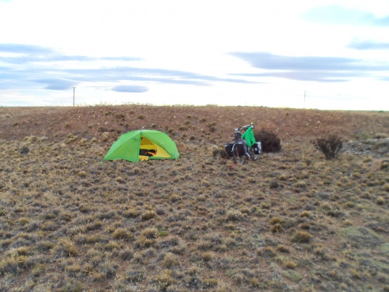 Am nächsten Morgen machte ich mich trotz starkem Gegenwind gut gelaunt auf den Weg. Gegen Mittag traf ich die nächsten zwei Radnomaden. Jons (Nähe Stuttgart) und Martina (Schaffhausen) sind seit 17 Monaten unterwegs: Süddeutschland bis Spanien – Schiff bis Panama – Segelschiff bis Kolumbien – Südamerika bis Argentinien. Sie wollen jetzt wieder nach Norden und im April von Brasilien wieder ein Schiff nach Europa nehmen. Am Nachmittag liess der Wind dann nach und ich kam ganz gut voran. Trotzdem reichte es nicht mehr bis La Esperanza, sodass ich 30 km vorher im Wind- und Sichtschutz eines Erdwalls zeltete. Teilweise schaffte es der Wind aber auch über den Wall und es wurde eine kühle Nacht. Am frühen Morgen brach ich dann das Zelt ab und machte mich an die restlichen 30 km nach La Esperanza. Auf diesem Teil blies mich der Wind beinahe von der Strasse und ich musste einige Male wieder vom Seitenstreifen auf die Strasse zurück korrigieren. Obwohl ich “schon” um 11.00 ankam (nach 3 Stunden Nettofahrzeit!), entschied ich mich, hier zu übernachten. Um 20.00 sagte man mir im Restaurant noch, die Küche öffne erst in einer Stunde und so machte ich mich auf, in der Tankstelle vis à vis zu essen.