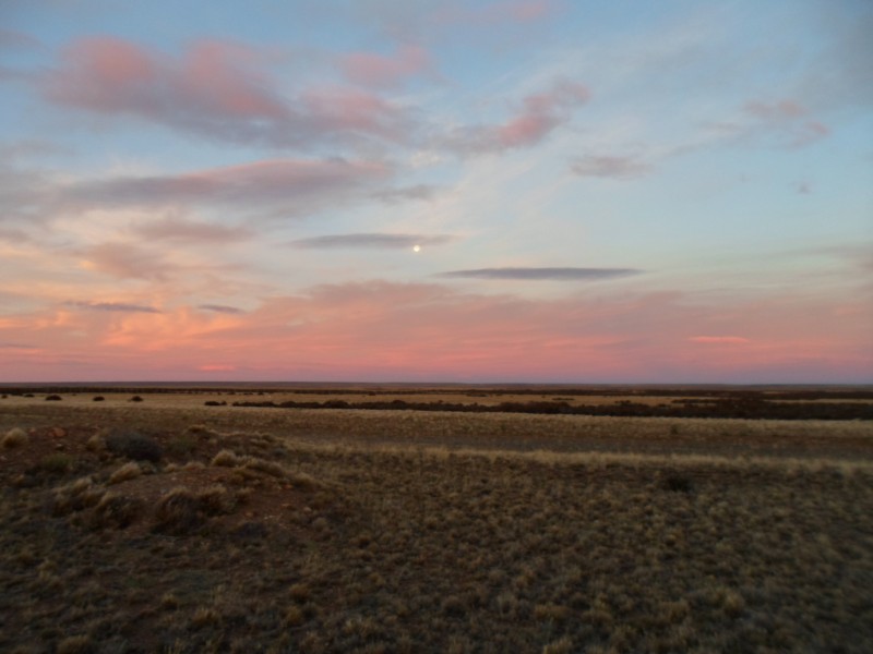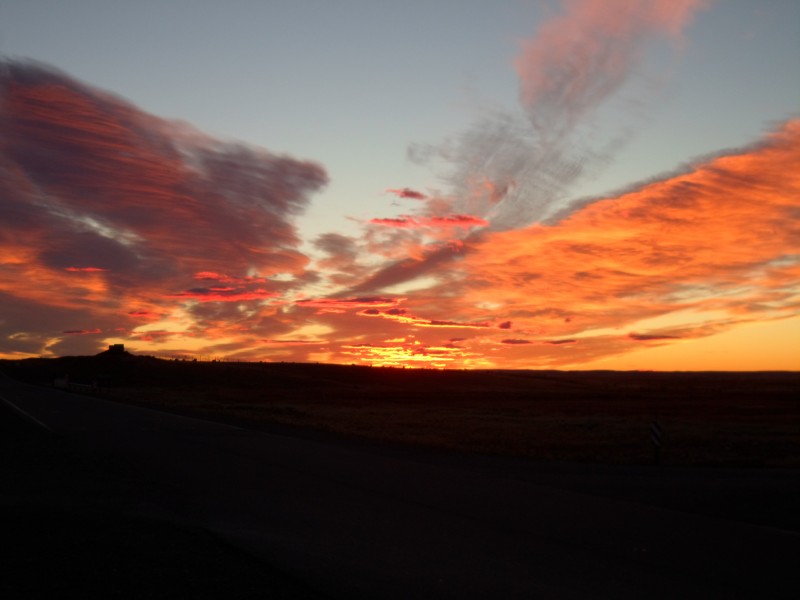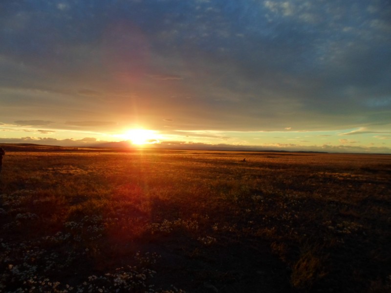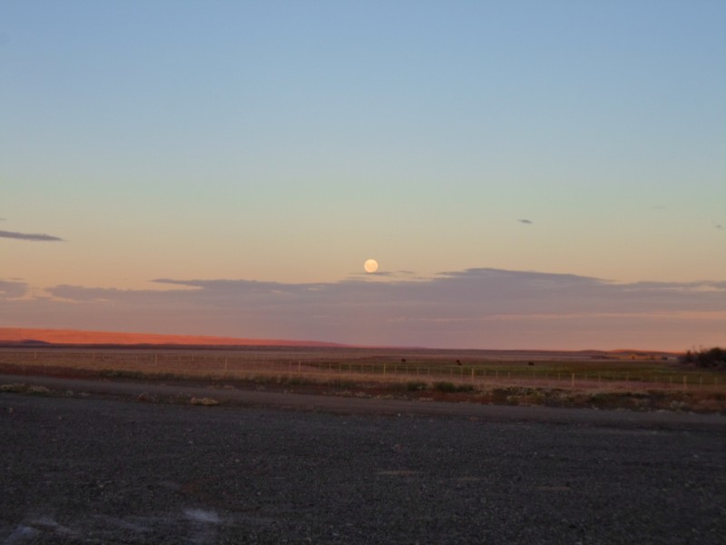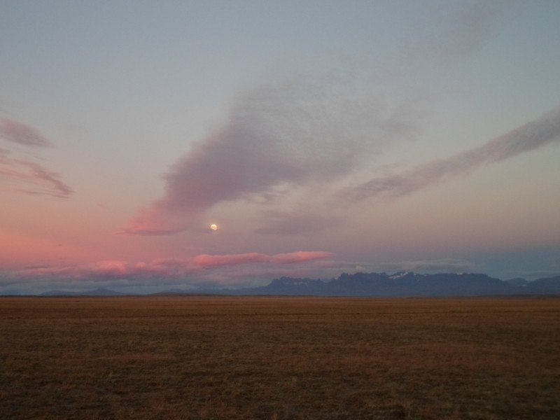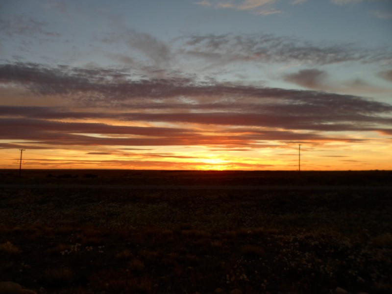 Seit der Ankunft in La Esperanza hatte ich mich versucht darauf vorzubereiten, am nächsten Tag 8 – 10 Stunden gegen den Wind radeln zu müssen, um die knapp 80 km nach Tapi Aike zu schaffen. Unmotiviert schaute ich also am morgen mal durch die Spalten im Fensterladen und entdeckte eine schlaff herunterhängende Flagge und einige aufrecht stehende Bäume – Windstille! Also nichts wie auf, packen, frühstücken und los. Gleich nach dem Start musste ich nach links abbiegen: und da waren die Berge in gar nicht mehr so weiter ferne endlich zu sehen. Tatsächlich blieb es den ganzen Tag windstill und sonnig und erst am Nachmittag kam noch ein Lüftchen auf. In Tapi Aike gibt es eine Estancia, auf der Übernachtungsmöglichkeiten angeboten würden. Erst wollte ich aber beim Kiosk an der Tankstelle was trinken. Gleichzeitig kamen auch Juanfran (Spanien) und Agatha (Polen) dort an. Sie waren ebenfalls in Buenos Aires gestartet, von Puerto Madryn aber nach Westen und die Carreterra Austral nach Süden gefahren – jene Strecke die ich eigentlich später hoch will. Sie wollten nebenan bei der Polizeistation fragen, ob sie im Windschatten des Gebäudes zelten dürfen. Ich wollte aber erst noch einkehren. In dieser Zeit erreichten Stefan aus Freiburg (D), Florin aus Rumänien und Galina aus Estland die Tankstelle. Sie kamen vom Nationalpark Torres del Paine und sind ebenfalls in nördlicher Richtung zur Carreterra Austral unterwegs. Nach einigen Tipps für den Nationalpark radelten Sie weiter, während ich mich entschied, mich den anderen zwei Radlern anzuschliessen und mein Glück bei der Polizeistation zu versuchen. Ich traf sie dort beim Abwasch – sie durften nicht nur zelten sondern auch die Küche benutzen und am Abend gab’s sogar noch eine warme Dusche. Der Tag endete mit einem wunerschönen Sonnenuntergang.