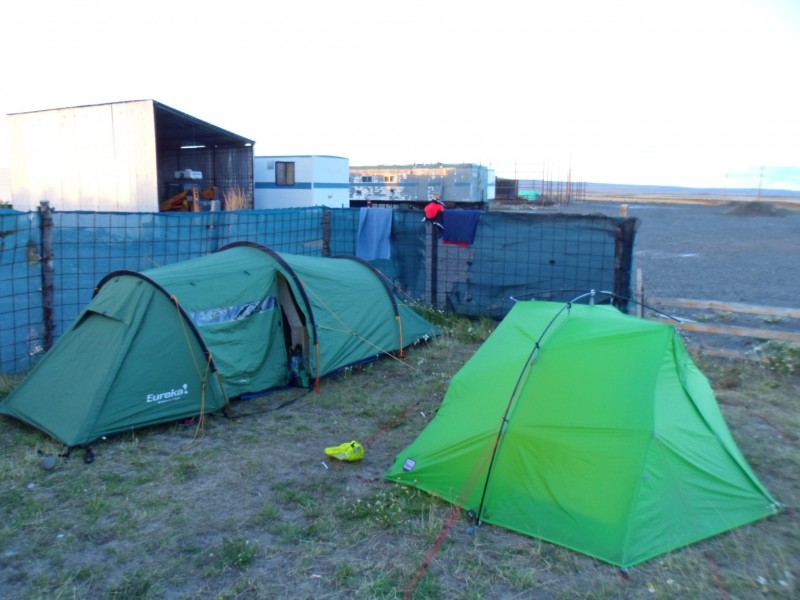 Eigentlich wollten wir am nächsten Morgen früh loslegen, standen aber später als geplant auf. Der supernette Polizist Walter lud uns noch auf eine Runde Mate ein und so fuhren wir erst um ca. 08.45 ab. Das sollte sich rächen! Nach beinaher Windstille während der ersten halben Stunde fing danach der Gegenwind immer stärker an zu blasen, sodass wir die Hügel aufwärts teilweise schieben mussten. Unterwegs kamen uns André Costa und Ana Vivian aus Florianopolis (Südbrasilien) entgegen. Bei ihnen kann ich bei Gelegenheit wegen Tipps für die geplante Strecke von Buenos Aires über Uruguay und Südbrasilien zu den Wasserfällen von Iguazú nachfragen. Irgendwann wollte es Galina dann mit Autostopp versuchen. Gleich der erste Lieferwagen hielt auch an, hatte aber nur Platz für einen Radler mit Ausrüstung. So nahm er mich die ca. 10 km bis zur Abzweigung nach Chile mit. Dort wartete ich lange und fragte sogar andere Autofahrer nach, ob sie noch oben wären. Da ich kaum Windschutz fand und teilweise Sand und Steine der Schotterstrasse mit geblasen wurden, machte ich mich nach ca. 1 1/2 Stunden auf den Weg zur Grenze, um dort zu warten. Nachdem ich den Ausreisestempel im Pass hatte, ass ich was und wartete weiterhin auf die zwei. Ich wollte grade einem Busfahrer fragen, ob er sie gesehen hätte, als die zwei auf dem nahen Hügel auftauchten. Sie fanden keine Mitfahrgelegenheit und mussten den Ganzen weg schieben. Deshalb fragten sie beim Zoll nach, ob es möglich sei, dort zu zelten. Die Zöllner zeigten uns ein altes baufälliges Gebäude, wo wir über Nacht bleiben könnten. Nicht besonders einladend aber zumindest Wetter- und (einigermassen) Windgeschützt. Ich fühlte mich dort aber nicht wohl und entschied mich nach dem Abendessen, die 8 km nach Cerro Castillo doch noch zu fahren, wo es neben einem Minimarkt auch zwei Hosterías geben sollte. Bei der Chilenischen Grenze musste ich mit Schrecken feststellen, dass ich den Pass nach dem abstempeln nicht mehr ordentlich eingepackt und in der Bruchbude liegengelassen hatte. Zum Glück hatte einer der netten Zöllner ein Auto und so fuhren sie mit mir zu zweit zurück zur Argentinischen Station. Danach konnte ich dann problemlos einreisen. Im Minimarkt kaufte ich dann noch ein paar Sachen, um meine Ankunft in Chile zu feiern. Danach machte ich mich voller Vorfreude auf ein warmes Bett auf die Suche nach den Unterkünften. Die erste Frau meinte, es gäbe keine, der zweite erzählte von einer ganz im Westen und einer anderen ganz im Osten, während der Marktbesitzer sagte, nur noch die im Osten sei geöffnet. Nachdem ich alles abgefahren hatte musste ich feststellen, dass leider die Frau am Anfang recht hatte. Also doch wieder das Zelt aufstellen. Der Marktbesitzer hatte mir erzählt, es gäbe einen öffentlichen Platz, auf dem man zelten könne. Er war zwar hell beleuchtet, lag aber hinter hohen Schutzwällen windgeschützt und zudem nur einen Block von einer öffentlichen (und auch geöffneten) Toilette entfernt. Gleich nebenan entdeckte ich dann auch noch den Warteraum der Bushaltestelle, der sich ebenfalls angeboten hätte. Mein Zelt stand aber schon und deshalb packte ich mich möglichst warm ein und schrieb noch schnell meine Notizen. Und gleich danach schaltete die Zeituhr um 00.30 die Beleuchtung aus.