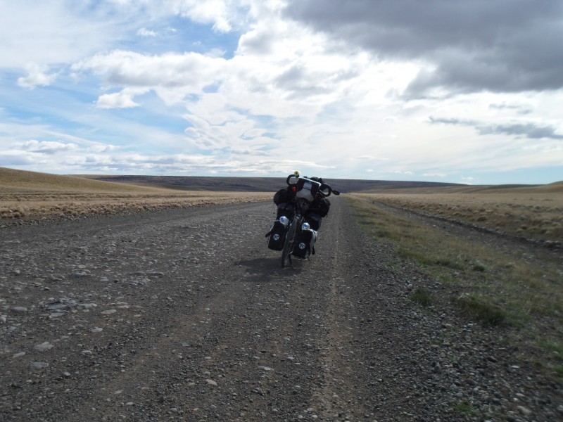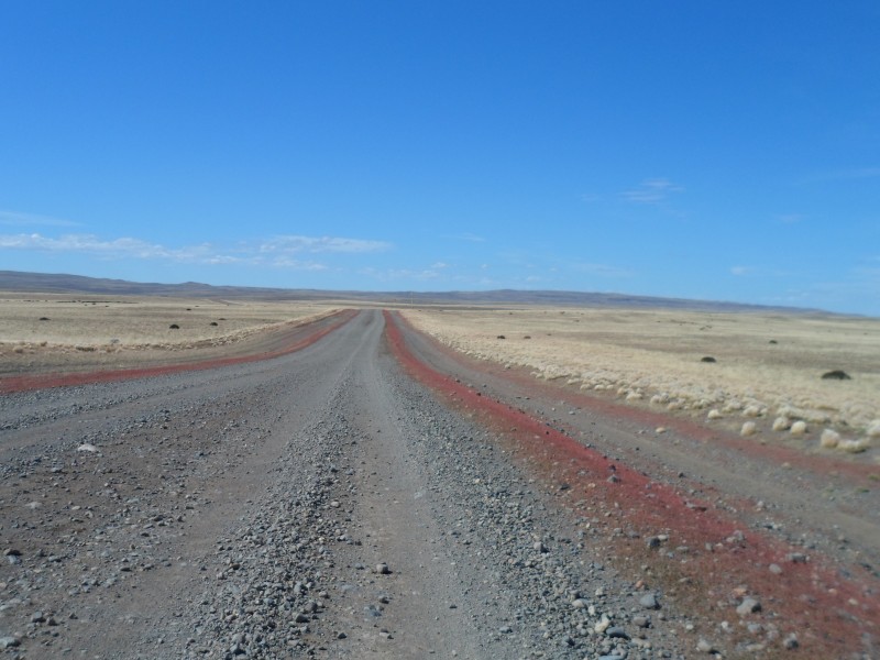 Am nächsten Tag ging’s dann mühsamer weiter. Die ersten 12 km bis zur Abzweigung in Cerrito gingen mit Seitenwind noch, danach kämpfte ich mit Gegenwind. El Calafate bis am Abend zu erreichen schien in weite Ferne zu rücken. Nach 30 km (Ø 9,31 km/h) hatte ich die Nase voll und hoffte, dass mich ein Pickup mitnimmt. Das anhaltende Auto war aber zu klein, um ein Velo zu laden und so zogen sie mich bis kurz vor’s Ziel. Die letzten 4 km hinunter ins Städtchen und zum Hostel legte ich dann wieder ohne Hilfe zurück.