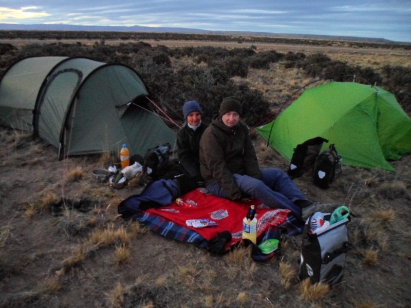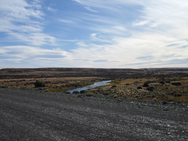 Am nächsten Tag ging’s dann wieder weiter und ab jener Stelle, bei der ich auf dem Hinweg Richtung Cerro Castillo abgebogen war, hatte ich endlich mal Rückenwind. Beim Windschutz nach ca. 10 km traf ich eine Singapurerin und einen Engländer, die gerade Mittagspause machen wollten. Das hatte ich zwar erst in Tapi Aike vor, trotzdem gesellte ich mich zu ihnen. Zwischendurch hielt dann auch noch ein Portugiese auf einen Schwatz an. Nach der Pause machte ich mich wieder auf den Weg und erreichte kurz darauf Tapi Aike, wo ich mir nochmals eine Pause bei der Tankstelle gönnte. Ich entschloss mich, doch noch weiterzufahren und war positiv überrascht, dass ich die Landkarte nicht richtig gelesen hatte. So ging die Schotterstrasse nach Cerrito nicht im rechten sondern ca. in einem 45°-Winkel weg. So hatte ich auch weiterhin Rückenwind und “flog” nur so über die überraschend gute Piste. Nach knapp 120 km merkte ich, dass ich am Hinterrad Luft verlor. Ich versuchte es einfach mal mit pumpen – vielleicht konnte ich die letzten 20 km ja so noch überbrücken. Nach 2 km musste ich aber schon wieder nachpumpen – letzter Versuch. Dabei traf ich einen Tschechen, der mir von zwei weiteren Radlern kurz hinter ihm erzählte. Er war leicht verwundert, als ich ihn fragte, ob es sich um Aarauer handle. Weitere 2 km weiter traf ich dann (mit schon wieder beinahe plattem Reifen) auf Markus und Yolanda, die ich beim Busbahnhof in Puerto Madryn kennengelernt hatte. Sie waren am gleichen Tag in El Calafate gestartet, wo ich ja hinwollte. Wir haben dann ein bisschen gequatscht und meinen Schlauch gewechselt. Da es schon Abend und vor allem auch beinahe windstill war, beschlossen wir, gleich neben der Ruta 40 zu zelten.