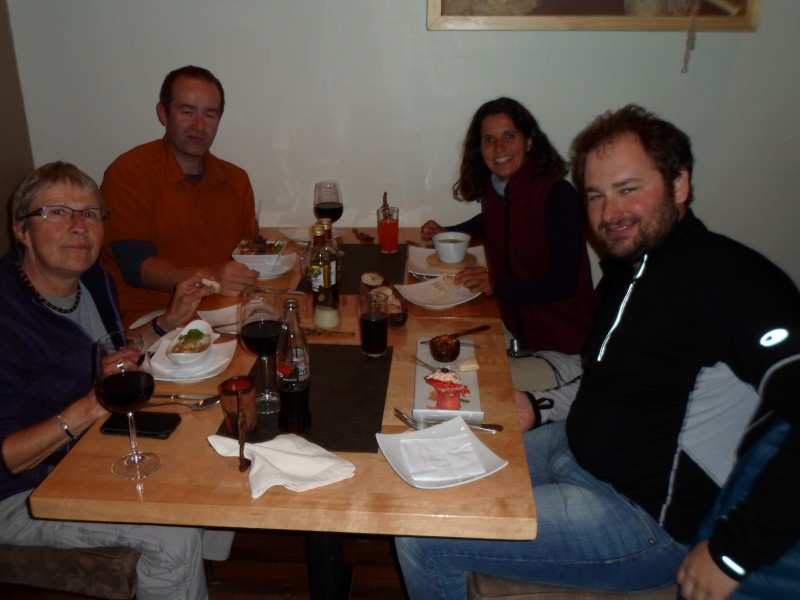 Dirk empfahl uns, nicht nach Bariloche weiterzufahren sondern in Llao Llao (spanisch Jao Jao, argentinisch: Schao Schao) zu bleiben. In Bariloche gäbe es einfach viele Läden, Hotels, Restaurants und sonstige touristische Infrastruktur, die Leute kämen aber wegen der Umgebung und die sei bei ihnen 😉 Er bot uns auch an, im riesigen Garten zu zelten, was Yolanda und Markus dann auch machten. Ich schlug mich immer noch mit meiner hartnäckigen Erkältung rum und bevorzugte deshalb eine etwas wärmere Behausung. Am ersten Abend hatten wir uns in Bariloche nochmals mit Irene zum Essen verabredet. Sie kam auf dem gleichen Weg wie wir, hatte aber eine Rundreise gebucht. Die Zeit verging wieder einmal wie im Flug und wir machten uns ziemlich spät auf den Weg zum Bus zurück nach Llao Llao. Irene gab mir noch einige Antibiotikatabletten mit, da ich offensichtlich kurz vor einer Kieferentzündung stand. Ich war natürlich dankbar, wollte aber doch noch die kommende Nacht abwarten. Am nächsten Morgen ging es mir bereits besser und ich konnte die Tabletten zu meinen übrigen Medikamenten versorgen. Die restlichen Tage in Llao verbrachten wir mit einem Ausflug auf den Cerro Llao Llao, einer 25 km-Rundfahrt mit dem Velo inkl. Fondueessen auf dem Circuito chico, einer Sesselliftfahrt auf den Cerro Campanario sowie viel lesen und ausruhen. Dabei konnten ich meine Erkältung und Yolanda ihre Sehnenscheidenentzündung auskurieren.