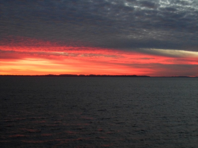 Durch den Sturm – ausnahmsweise sprachen sogar die Einheimischen von starkem Wind – musste die Fähre vor dem Hafen warten und konnte deshalb erst mit sieben Stunden Verspätung einlaufen. Wir konnten uns also genügend Zeit für den Nachtisch und einen Drink in einer Bar lassen, mussten wir doch erst nachts um 01.00 wieder beim Treffpunkt sein. Danach ging’s zügig auf’s Schiff und um ca. 03.30 war ich im Bett. Im Massenschlag hatte ich einen ziemlich guten Platz erwischt. Er lag am Ende der letzten Kabine, sodass praktisch keine Lauferei vorne durch ging. Zudem hatte ich ein weniger einengendes Gefühl als bei den Viererkabinen, bei denen einfach noch eine Tür angebracht war.