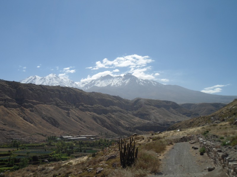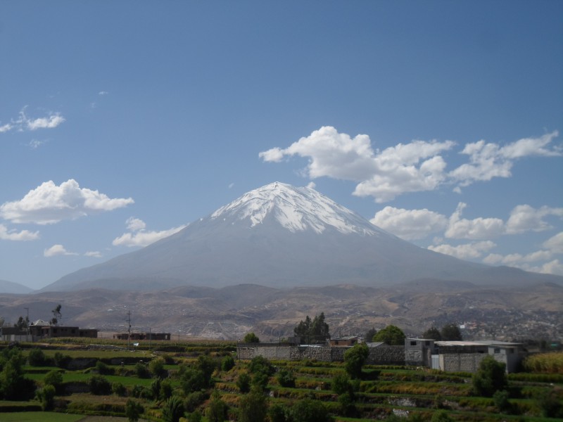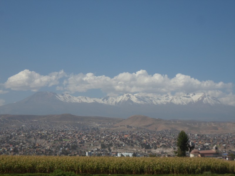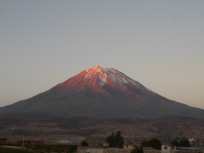 Percy (Tete) wollte mich gleich abholen kommen. Da ich aber schon für die kommende Nacht bezahlt hatte, verabredeten wir uns für den kommenden Morgen. Nach dem Fruehstück kam er also ins Hotel und ich zügelte in ihr Haus in Cayma. Ob es sich dabei um einen (Vor-)Stadtteil oder eine eigene Gemeinde handelt, habe ich nicht so genau verstanden. Neben Vater Percy wohnten auch die Grosseltern im grossen Haus – nicht zu vergessen der etwas verrückte Hund. Ich konnte mein Zimmer im ersten Stock beziehen und vom Balkon einen tollen Ausblick auf den Vulkane Misti und Picchu Picchu bewundern. In den Gipfeln des Picchu Picchu (Quechua: Berg Berg) kann man mit ein bisschen Fantasie eine liegende Person erkennen, weshalb man auch vom schlafenden Inka spricht.