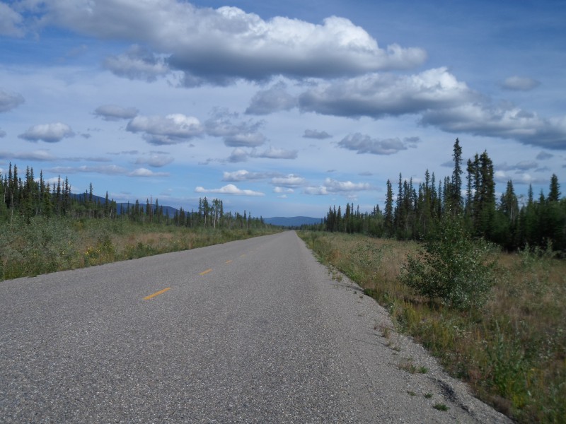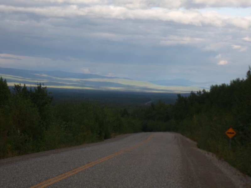 Nach zwei interessanten Tagen machte ich mich wieder auf den Weg. Durch die Verlängerung am Abend kam ich erst spät los. Zuvor musste ich auch noch auf die Post und zum Schraubenladen. Am Vorabend hatte ich bemerkt, dass ich eine Schraube am vorderen Gepäckträger verloren hatte. Nach dem Einkauf konnte ich meine Sprachkenntnisse wieder ein bisschen auffrischen: Erst plauderte ich mit zwei Mexikanern, danach mit einer Gruppe Deutschen und schliesslich mit einem US-Ami. Als ich nach dem Mittagessen endlich losfuhr, zeigte meine Uhr bereits ca. 15.20 an! Endlich ging es mal ein bisschen flach dahin. Dafür wusste der Wind nicht, dass er laut Reiseführer eigentlich von Nordwesten und somit von hinten kommen sollte :-/ Bald kam ich zur ersten Baustelle. Dort musste ich mein Velo wieder auf das Führungsfahrzeug verladen. Während der kurzen Fahrt begann es zu nieseln, sodass ich nach der Baustelle mein frisch imprägniertes Regenzeug ausprobieren konnte. Der Regen hörte bald wieder auf, das Regenzeugs musste ich aber wegen den darunter durchgeschwitzten Kleidern als Windschutz anbehalten. Bei der nächsten Baustelle durfte ich dann selbst durchradeln. Dabei zeigte sich das unpassende Profil am in Palmer gewechselten Reifen. Auf der feuchten Erde fuhr es sich wie auf Leim! Nach ein paar hundert Metern war ich dann aber wieder auf dem Asphalt. Nach ca. 50 km begann die Strasse dann wieder etwas hügeliger zu werden, allerdings nur mit moderaten ca. 3%. Am Abend fand ich schliesslich wieder mal einen Parkplatz (oder sowas Ähnliches), wo ich sichtgeschützt mein Zelt hinstellen konnte. Zum Znacht wollte ich mir Rühreier machen. Da das ja doch etwas geruchsintensiver ist, fuhr ich zum kochen etwas zurück. Das stellte sich als gute Entscheidung heraus. Ich briet die Eier nämlich in der falschen Pfanne. Obwohl nur wenig angebrannt war, schaffte ich es nicht, die Pfanne wieder sauber zu kriegen. Ich füllte sie also mit Wasser und Abwaschmittel und liess sie über Nacht dort stehen. Die anderen Taschen mit Lebensmitteln liess ich auch gleich dort.