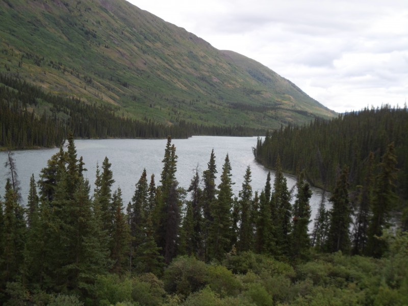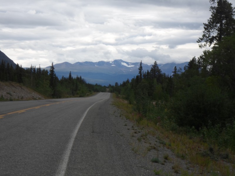 Am nächsten Morgen fuhr ich erst mal die 800m zurück, um meine über Nacht deponierten Sachen zu holen. Trotz des Einweichens liess sich die Pfanne noch immer nicht reinigen. Ich versuchte es noch mit heissem Wasser, gab schliesslich auf und stopfte sie zum Abfall. Das Zelt war noch feucht und die Regenkleider immer noch von innen nass. Ich drehte sie also und stellte das Zelt an die Sonne. Die nächsten 1 1/2 Stunden verbrachte ich dann lesend und endlich war alles trocken. Ich packte und machte mich wieder auf in den Gegenwind. So hielt ich bereits nach 20 km zur Mittagspause an einem Rastplatz an. Dort traf ich Heather und Wayne, die in ihrem Auszeitjahr Kanada und die USA in ihrem Camper bereisen. Sie füllten meinen Wasserbeutel und gaben mir ein Fresspäckli mit Äpfeln und Riegeln. Schon am Morgen überlegte ich mir, nach Whitehorse zu trampen. Ich war mir aber immer noch unschlüssig, weshalb ich die beiden nicht nach einer Mitfahrgelegenheit fragte. Am Nachmittag kämpfte ich weiter mit dem Gegenwind und einigen Anstiegen. So freute ich mich, als ich vis à vis des Campingplatzes eine Lodge mit Restaurant sah. Ich freute mich auf eine Cola, musste dann aber feststellen, dass sie heute früher geschlossen hatten. So fuhr ich um 18.30 mit der Absicht auf ein frühes Zubettgehen auf den Zeltplatz. Dort traf ich aber Corinna und Simon aus Bern. Sie haben für ein paar Wochen ein Auto für Alaska und das Yukon Territory gemietet, wechseln dann für den Indian Summer an die kanadische Ostküste und fliegen schliesslich nach Kolumbien, um während ihres Reisejahres Südamerika kennenzulernen. Sie luden mich zum Znacht ein: grillierte Würstchen und Folienkartoffeln. Danach sassen wir bei einem Schluck Wein und einer Tasse Schoggimilch noch lange zusammen und plauderten, bis wir uns schliesslich kurz vor 02.00 in die Zelte verkrochen.