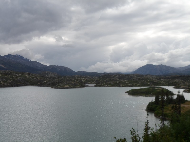 Mit dem Start um die Mittagszeit war ich natürlich eher spät dran. Ich kämpfte wieder mit Gegenwind und Steigungen und als i-Tüpfelchen regnete es auch noch. Immerhin hörte der Regen bald wieder auf. Am Abend erreichte ich Carcross. Ich erwartete immer, dass hier wohl eine Strassenkreuzung sein müsse. Am Ortseingang las ich dann, dass Carcross früher Caribou Crossing hiess. Die Zimmer im Ort waren alle ausgebucht, die Empfehlung, 10 km zurückzufahren fand ich nur mässig schlau. Ich wollte eigentlich schon wild zelten, entschied mich dann aber für den Zeltplatz, da dort gratis Feuerholz verfügbar war und ich so meine nassgeschwitzten Kleider trocknen konnte. Ich fand einen tollen Platz und auch das Feuer brannte schnell. Eine Einheimische auf dem Mountainbike plauderte noch ein bisschen mit mir. Ich brauchte einige Zeit, um mein Tagebuch wieder nachzuschreiben. Als ich zusammenräumte, sah ich plötzlich zwei Augen im Licht der Taschenlampe aufblitzen. Es war ein Fuchs, der es auf meine Cookies abgesehen hatte. Ich verjagte ihn ein paar mal, aber er kam immer wieder. Ich warf einen Stein in seine Richtung und war überrascht, dass er nicht wegrannte sondern den Stein genau prüfte. Offensichtlich hatten ihm andere Camper schon Lebensmittel zugeworfen! Schliesslich schlug ich mit einer Tasche in seine Richtung auf den Boden, worauf er das Weite suchte. Nach ca. 15 min trabte er nochmals auf dem Strässchen vorbei und guckte zu mir rüber. Ich rannte ihm hinterher und er machte sich aus dem Staub. Meine Lebensmitteltaschen verstaute ich in dieser Nacht sicherheitshalber auf dem Dach des Feuerholzhäuschens.