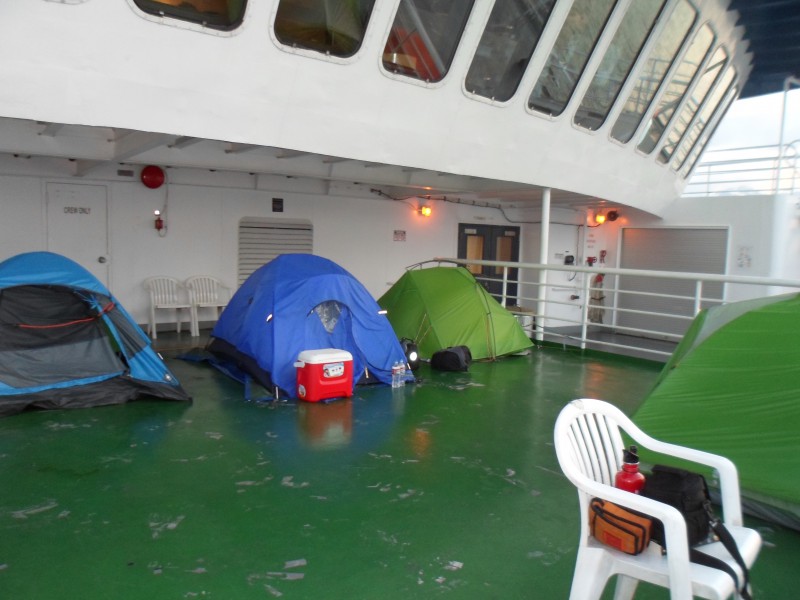 Eine Besonderheit der Inside Passage Fähre ist, dass man auch an Deck zelten kann, was in diversen Reiseführern empfohlen wird. Ich stellte also mein Zelt hin und brauchte alle Taschen, um es am Boden zu halten. Anstatt des standardmässigen “Panzerklebeband mitnehmen” meinte sie bei mir beim Buchen nur, es sei überhaupt kein Problem mit dem Zelt. Dann freute sie sich auch noch, dass ich einen Gaskocher habe, vergass aber den Hinweis, dass der erst an Land wieder benutzt werden konnte. Im Allgemeinen war der Zeltplatz aber ok. Ein paar kleinere Überlegungsfehler machten die Sache aber unnötig schwieriger. So sind zwar 80% des Decks überdacht, die Schräge führt das Regenwasser aber unter den überdachten Teil, wo es in den Unebenheiten des verzogenen Metalls liegenbleibt. So trocknete ich nach der ersten Nacht Innenzelt und Boden und benutzte doch meine Blache. Die zweite Nacht war dann toll. Die Zeit an Bord verbrachte ich mit rausschauen, lesen oder mit Dominik und Jasmin. Am Mittwoch gesellte sich auch Andreas aus Bern dazu. Er hatte eine Kabine privat gebucht und bot mir spontan an, die zweite Koje zu benutzen. Natürlich nahm ich das gerne an. Am Donnerstagmorgen erzählte mir Dominik, er habe bei seiner Morgenzigarette beobachten können, wie ein Angestellter das Deck mit einem Hochdruckreiniger vom nicht vorhandenen Schmutz befreit habe. Ich schaute nach und sah, dass tatsächlich jemand so bescheuert gewesen war. Bei mir hatte das zur Folge, dass das Wasser zwischen Blache und Innenzelt gespritzt wurde. Ich trocknete also meine Sachen und baute mein Zelt dann ab. Auch sonst packte ich wieder für die Weiterfahrt am nächsten Morgen. Wir vier trafen uns schliesslich zum Znacht um 19.30 – allerdings zu verschiedenen Zeitzonen, sodass wir je zu zweit assen 😉 Danach schlossen wir die Fährfahrt mit einem Jassabend ab.
