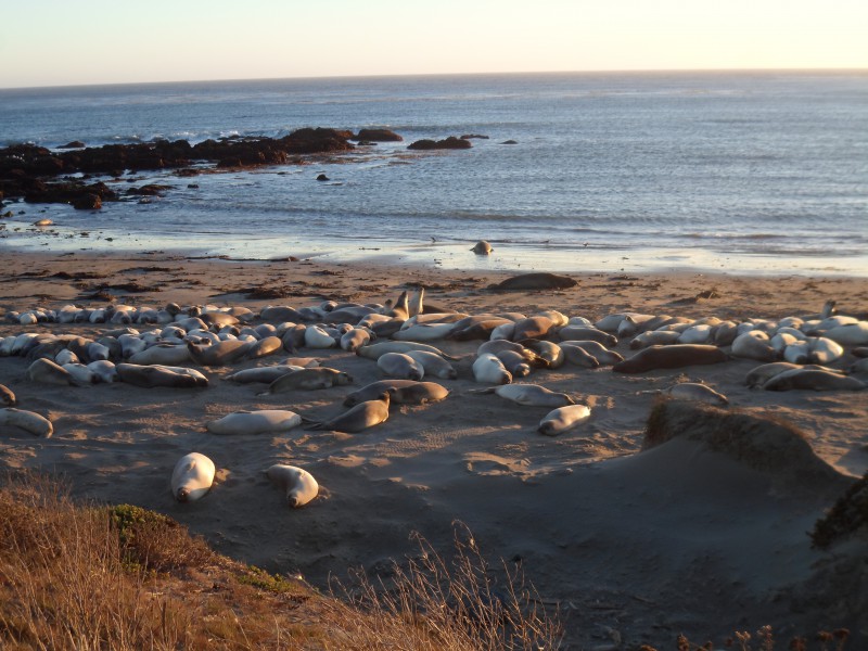 Mehr oder weniger gut ausgerüstet ging es wieder zurück auf’s Fahrrad. Da die Zeit bis Ende September (US-Visum) knapp wurde, fuhren mich Josef und Alene (begleitet von den Dackeln Hymie und Rusty) über die Hügelkette ans Meer und dann noch ein rechtes Stück auf der Küstenstrasse nach Süden. Am frühen Nachmittag stieg ich dann wieder auf – und hatte schon nach guten fünf Minuten Fahrzeit wieder eine “Panne”. Schliesslich stellten sich meine Befürchtungen als unbegründet heraus. Mit dem eben erst reparierten Wechsler (bzw. dessen Aufhängung) war alles in Ordnung. Es hatte sich lediglich die Kette hinter dem Blatt verklemmt 😉 Nach einem kurzen Einrollen ging’s gleich wieder in die Hügel entlang der Küste. Ich hatte zu Beginn ganz schön zu kämpfen, nach einer Stärkung in Ragged Point lief es dann besser – wohl vor allem weil es jetzt bergab ging. Kurz vor San Simeon hielt ich bei einem Aussichtspunkt an, um einen kurzen Blick auf eine Seeelefantenkolonie zu werfen. Die tiefe Sonne trieb mich aber weiter. Schliesslich musste ich doch meine Lampen montieren, bevor ich San Simeon Village bereits im Dunkeln erreichte. Ich entschied mich drum für Zimmer statt Zelt.