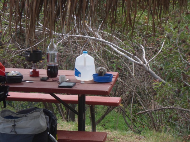 Wie von Gilberto angekündigt, hörte der Regen am frühen Morgen auf. Es war aber noch bewölkt und ziemlich frisch und so blieb ich noch ein bisschen liegen. Schliesslich packte ich bis auf das Zelt zusammen, frühstückte und las ein bisschen. Ein ziemlich fotogenes Eichhörnchen wollte auch mit frühstücken und putzte meine Schüssel – nach reiflicher Überlegung habe ich mich dann aber doch noch für einen Abwasch entschlossen. Das Zelt trocknete in der Zwischenzeit in der mittlerweile scheinenden Sonne. Schliesslich machte ich mich erst am Nachmittag auf den Weg. Die Campinggebühr galt nur bis 09.00. Danach währen weitere MXN 90 (ca. CHF 6.30) für die Tagesbenutzung der Anlagen fällig geworden. Da ich nichts nutzte und das WIFI sowieso nie funktionierte, hatte ich keine Lust auf Zusatzkosten. Ich ass deshalb was kleines beim Minimarkt und verliess das Gelände durch den Marktausgang. Die eher kurze Etappe nach San Vicente ging durch das ständige Auf und Ab dann trotzdem ganz schön in die Beine. Ich erreichte das Dorf kurz vor dem Eindunklen und wollte in einem Laden nach Unterkünften fragen. Davor stand ein Pickup und der Fahrer, ein Angestellter der Stadt oder Region Ensenada, sprach mich an und empfahl mir das Mini-Hotel Vivian. Das war ja einfacher als erwartet und im Vivian erhielt ich ein sauberes Zimmer – und nachts war zur Abwechslung mal so gut wie nichts vom Strassenlärm zu hören.
